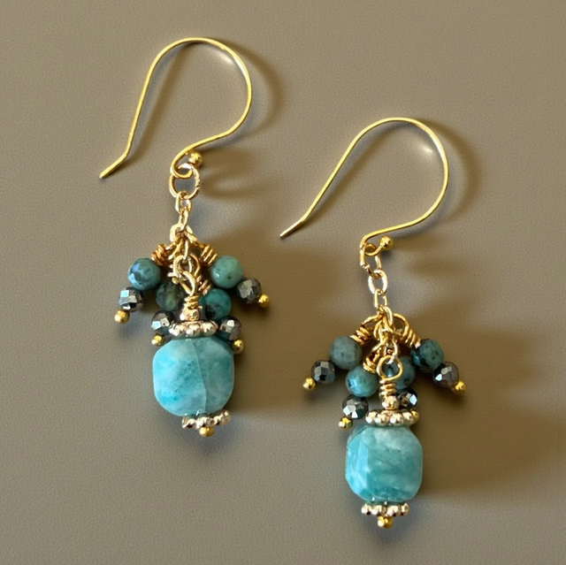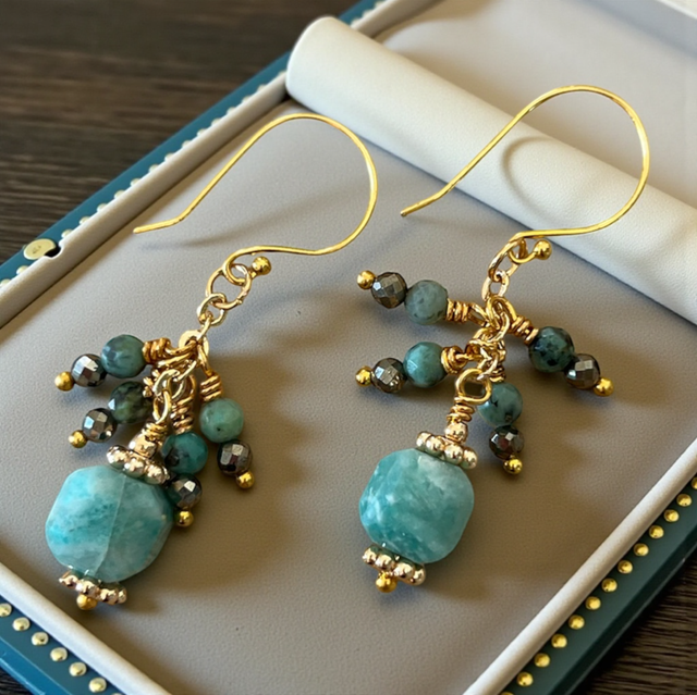 Des boucles d’oreilles pendantes élégantes et originales, alliant la douceur de l’amazonite à l’éclat métallique de la pyrite et aux reflets uniques de la turquoise africaine, disposés en forme de grappe pour un effet raffiné et graphique.