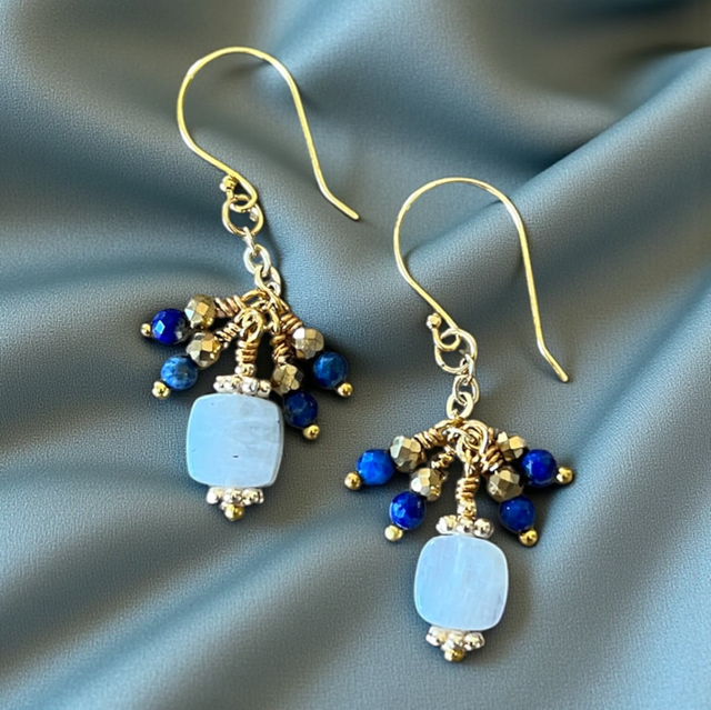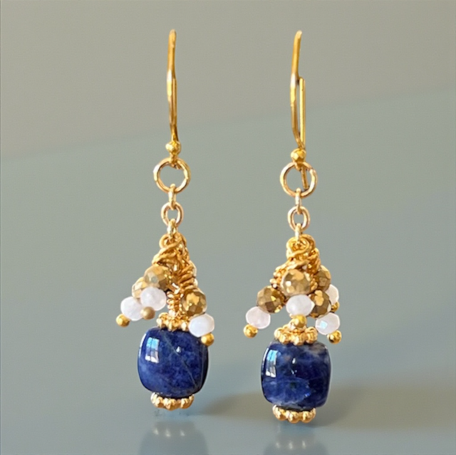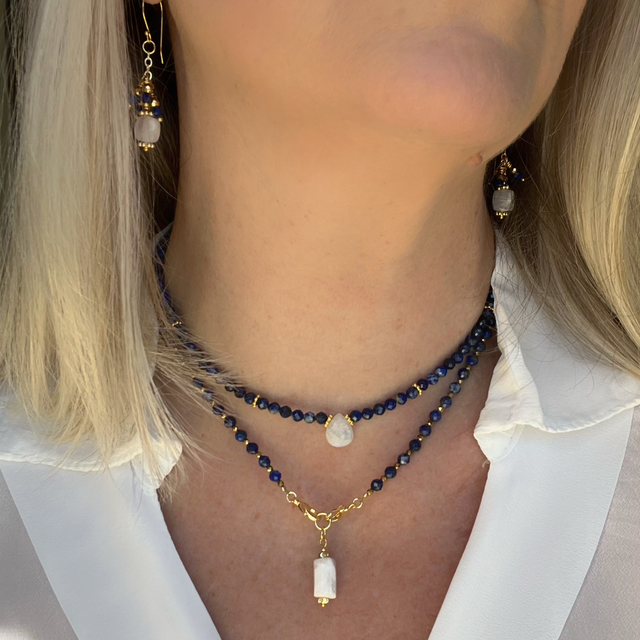 1. Version 1 : pierre de lapis lazuli suspendue au bout d’une grappe de 4 breloques en petites pierres de lune et pyrite facettée, pour un jeu de lumière subtil et raffiné.