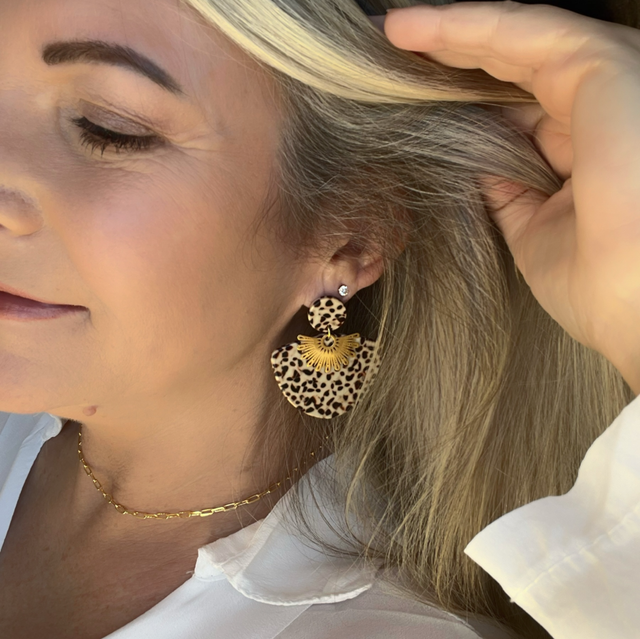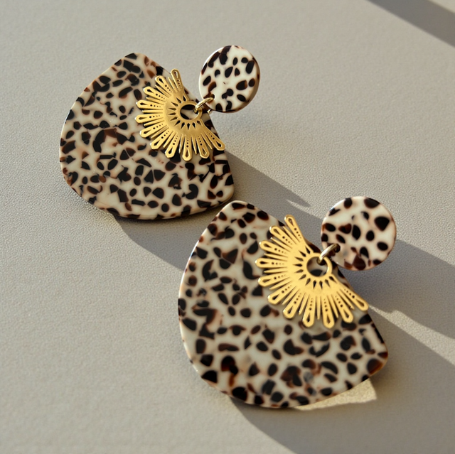 Affichez un style affirmé et tendance avec les boucles d’oreilles « Savana », un modèle audacieux mêlant influences ethniques et modernité. Leur grand pendentif géométrique en acétate (35x45 mm), tacheté marron-crème, offre un motif chaleureux et sauvage, rehaussé d’un superbe demi-soleil doré à l’or fin, délicatement superposé pour un effet graphique et lumineux. L’ensemble est relié à un joli clou d’oreille en acétate tacheté assorti, pour un look harmonieux et résolument tendance.