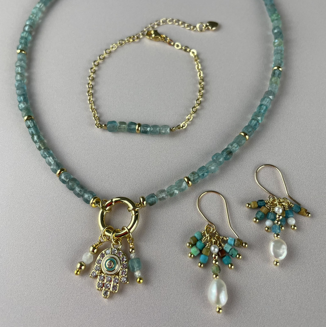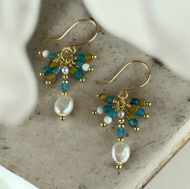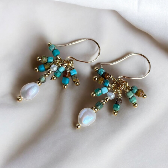 Élégantes et lumineuses, les boucles Sirène mêlent l’éclat de l’argent 925 (crochets) à de fines dorures en laiton plaqué or 24 carats. La grappe de breloques associe des perles de turquoise africaine aux nuances marines et une perle d’eau douce en finition, pour une allure bohème chic qui capte la lumière. Création artisanale, faite main en France par Sandja Créations, pensée pour les oreilles sensibles et le quotidien comme les occasions spéciales.