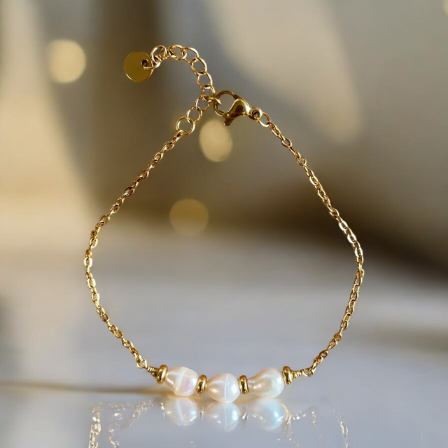 Apportez une touche d’élégance discrète avec ce bracelet fait main. Sa fine chaîne en acier inoxydable doré met en valeur des perles naturelles d’eau douce (qualité AA) et des perles dorées, offrant un rendu subtil et raffiné. Son design épuré s’adapte à tous les styles, idéal pour un look chic au quotidien ou lors d’occasions spéciales.