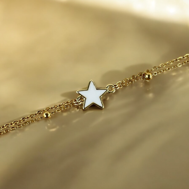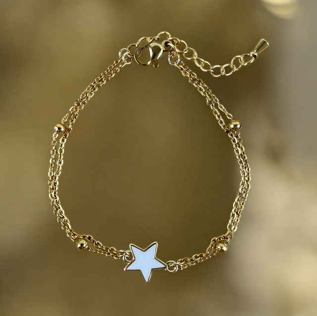 Alliant finesse et originalité, ce bracelet se compose d’une double chaîne en acier inoxydable : une maille fine et une maille satellite, reliées au centre par un délicat connecteur étoile en laiton émaillé. Un bijou raffiné qui apporte une touche céleste à votre poignet. Son design léger et aérien en fait un accessoire parfait pour un style quotidien ou une occasion spéciale. Facile à assortir, il sublime aussi bien un look décontracté qu’élégant.