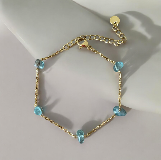 Le Bracelet Éclat d'Apatite est une pièce unique, faite main avec amour, qui associe l’acier inoxydable et les pépites d’apatite naturelle. Ce bracelet perlé, alternant chaîne délicate et pierres naturelles, apporte une touche d’élégance et de dynamisme à votre poignet.