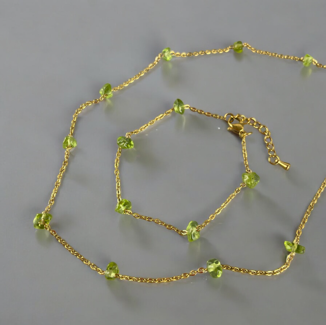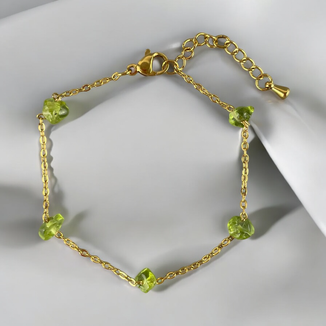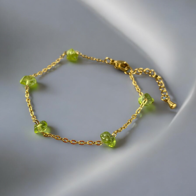 Laissez-vous séduire par ce bracelet raffiné qui allie la finesse d’une chaîne dorée en acier inoxydable à l’éclat naturel du péridot. 🌿 Ses pépites de péridot finement disposées apportent une touche lumineuse et élégante à votre poignet. Ajustable grâce à sa chaînette d’extension de 3 cm, il s’adapte parfaitement à toutes les morphologies. Un bijou délicat à porter au quotidien ou pour sublimer vos tenues. ✨