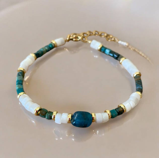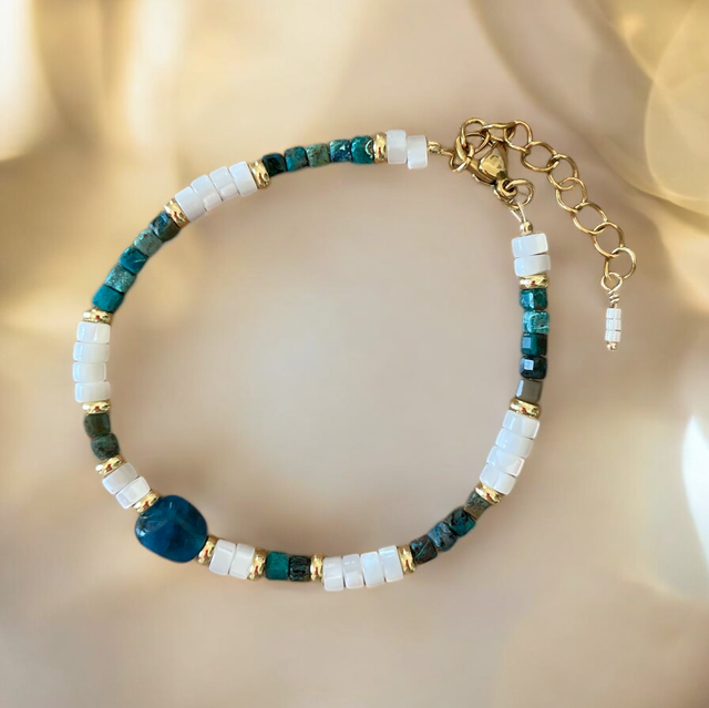Ce bracelet unique allie la beauté de l'azurite chrysocolle et de la nacre à la pépite d'apatite au centre, une pierre précieuse aux tons bleu-vert, connue pour ses propriétés énergétiques puissantes. Les perles dorées en laiton plaqué or 18 carats ajoutent une touche de luxe à ce bijou fait main. Un bracelet raffiné et énergisant, parfait pour compléter n'importe quelle tenue avec une touche de sophistication et de naturel.