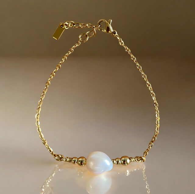 Créé et fait main par Sandja Créations, ce bracelet minimaliste sublime votre poignet avec une perle d’eau douce baroque de qualité AA, mise en valeur par de délicates perles dorées sur une chaîne fine. Son design épuré et sophistiqué en fait un bijou intemporel, parfait pour un usage quotidien ou une occasion spéciale.