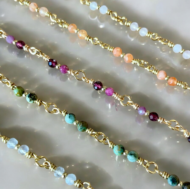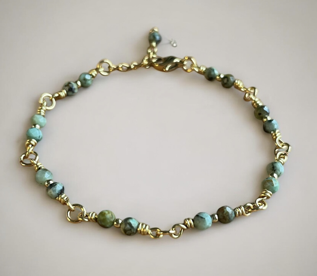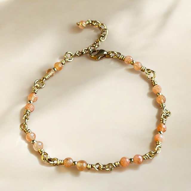 Sublimez votre poignet avec ce bracelet minimaliste créé et fait main par Sandja Créations. Monté sur une chaîne dorée en laiton anti-ternissement, il est orné de perles naturelles facettées aux reflets délicats. Disponible en Aigue-marine, Grenat, Pierre de Soleil, Turquoise africaine ou Quartz rose, il apporte une touche élégante et intemporelle à toutes vos tenues.