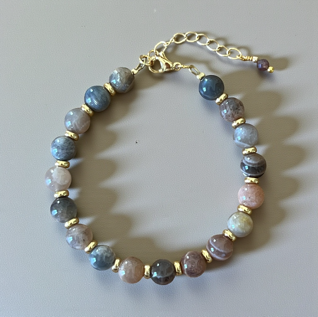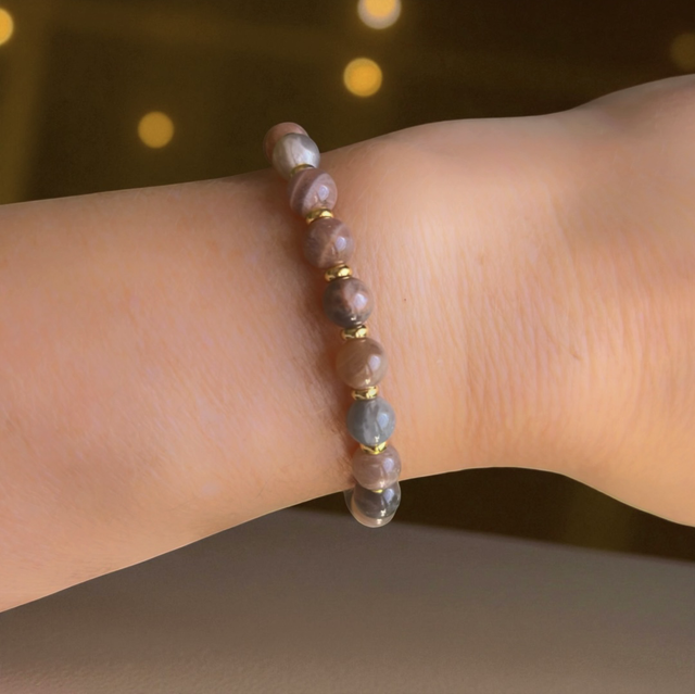 Élégant et lumineux, le bracelet “Révélation” est une création artisanale unique en perles de pierre de lune chocolat alternées avec de fines perles dorées en laiton plaqué or 18 carats.