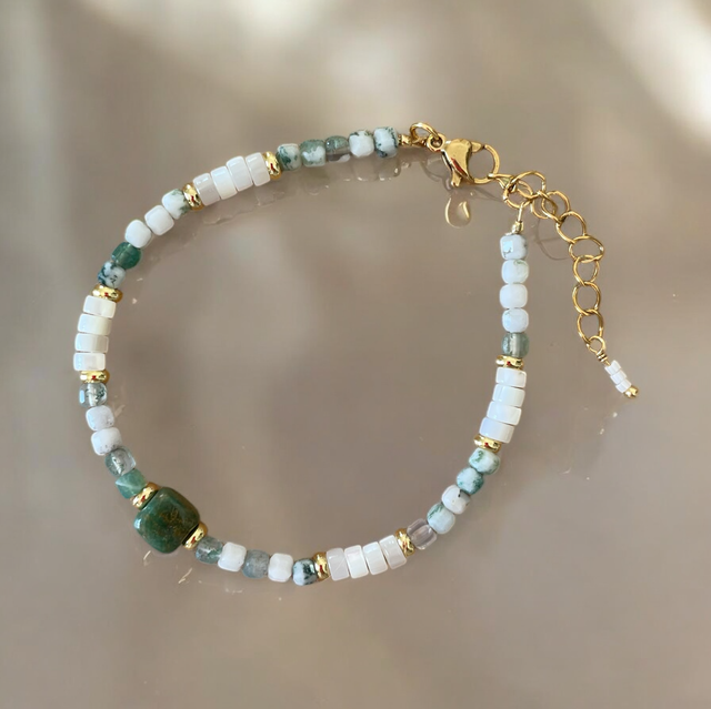 ✨ Bracelet femme en pierres naturelles – Agate mousse, nacre & jade vert ✨