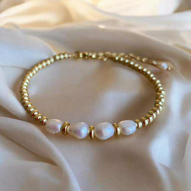 Raffiné et lumineux, ce bracelet fait main sublime votre poignet avec une perle naturelle au centre, entourée de perles rondes dorées et de fines rondelles en laiton plaqué or 18K.