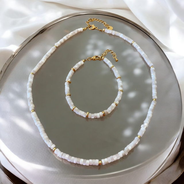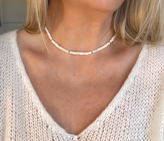 Sublimez votre cou avec ce choker raffiné et fait main par Sandja Créations. Conçu avec des perles Heishi de nacre naturelle AA, ce bijou lumineux capture la lumière pour une brillance subtile et une touche de raffinement naturel. Léger et élégant, il s’adapte aussi bien aux tenues décontractées qu’aux looks sophistiqués.