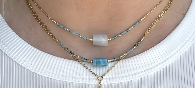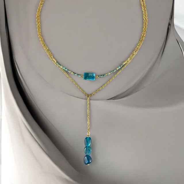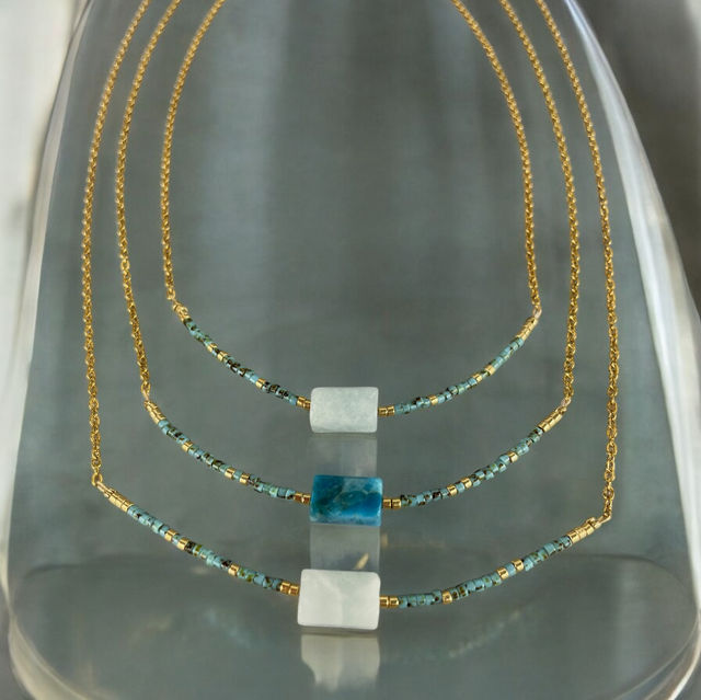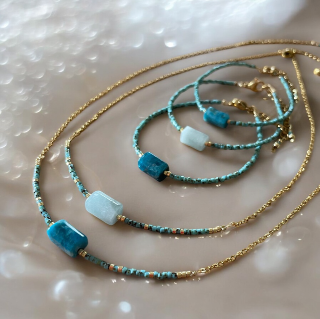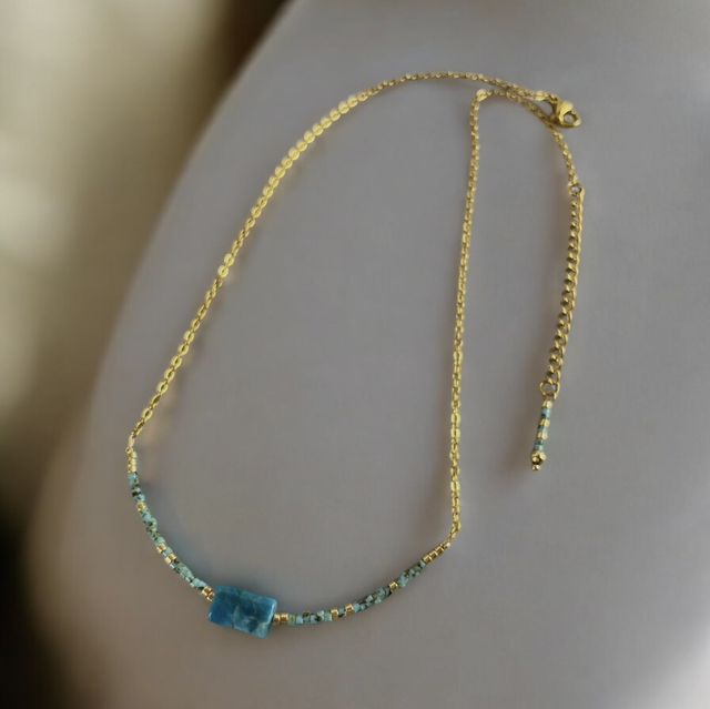 Élégant et minimaliste, ce collier ras du cou met en valeur une perle tube d’apatite bleue naturelle, encadrée de délicates perles Miyuki turquoises et dorées. Sa fine chaîne dorée en acier inoxydable lui confère une touche raffinée, idéale pour sublimer toutes vos tenues.