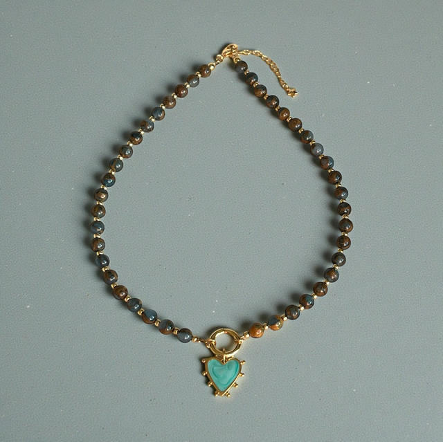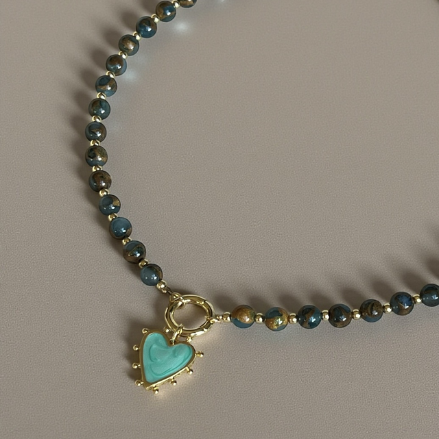 Plongez dans la fraîcheur des tons bleutés avec le collier Cœur Azur, une création lumineuse et délicate façonnée à la main par Sandja. Composé de perles lisses d’agate bleu lac, ce bijou évoque l’apaisement, l’évasion et la douceur de l’eau. En pièce centrale, un pendentif décoratif doré met en valeur un superbe cœur émaillé bleu turquoise, rempli d’or 18 carats, véritable touche de couleur et de féminité. Un collier moderne, raffiné et plein de caractère, idéal pour illuminer votre style en toute saison.