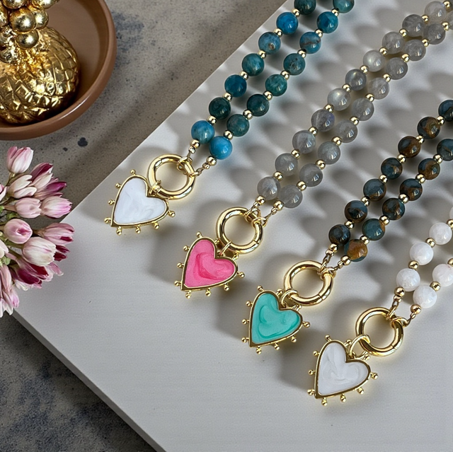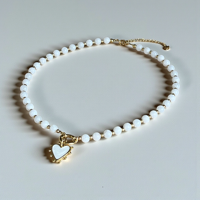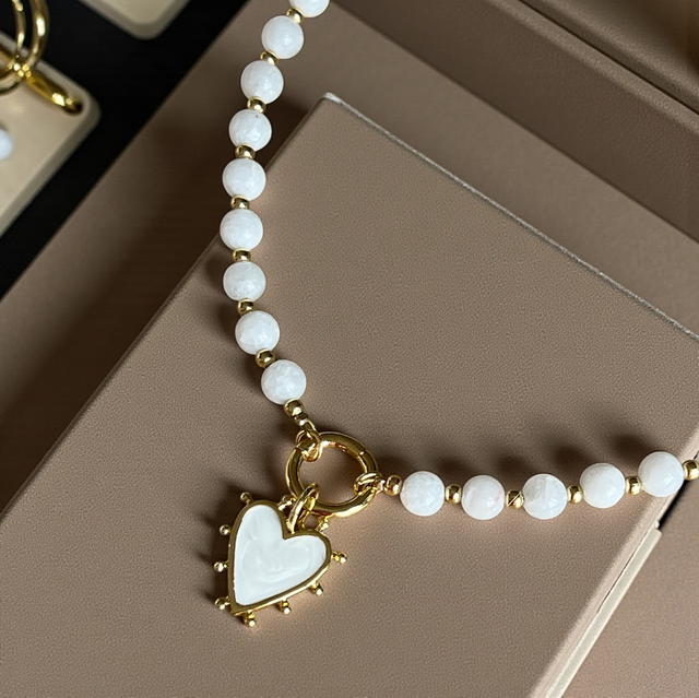 Laissez-vous séduire par la pureté et l’élégance du collier Cœur Neige, une création douce et lumineuse signée Sandja. Composé de perles lisses de jade porcelaine blanche, il dégage une aura délicate et raffinée. En pièce centrale, un pendentif décoratif doré met en valeur un superbe cœur blanc émaillé, rempli d’or 18 carats, symbole de douceur et de pureté. Un bijou minimaliste, intemporel et terriblement féminin, parfait pour illuminer vos tenues en toute saison.
