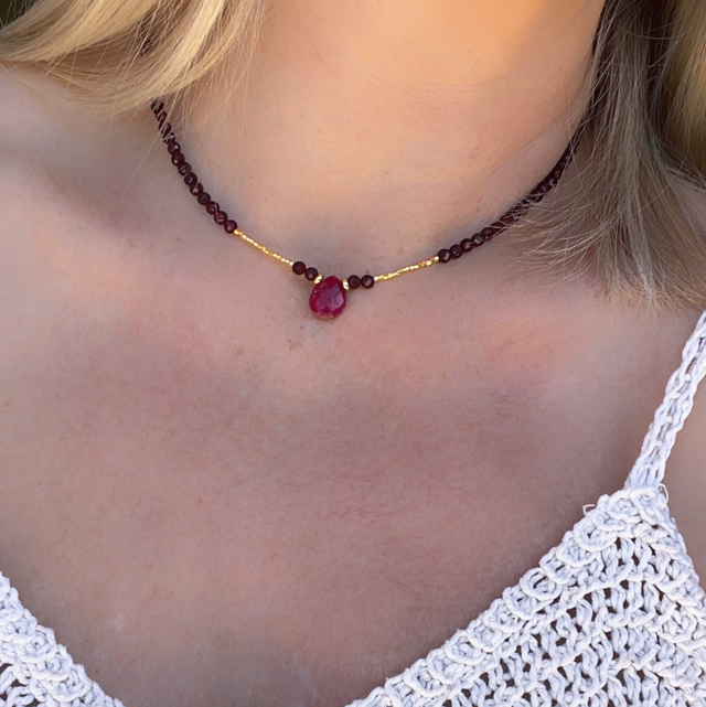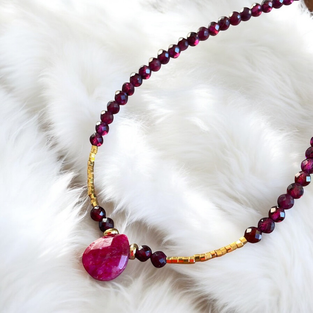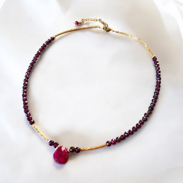 Collier Éclat de rubis – grenat facetté & perles Miyuki or 24K – ras-du-cou, fait main