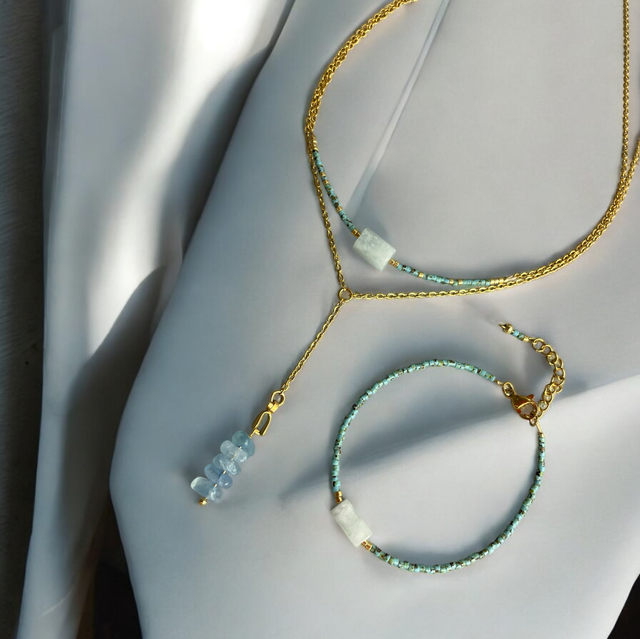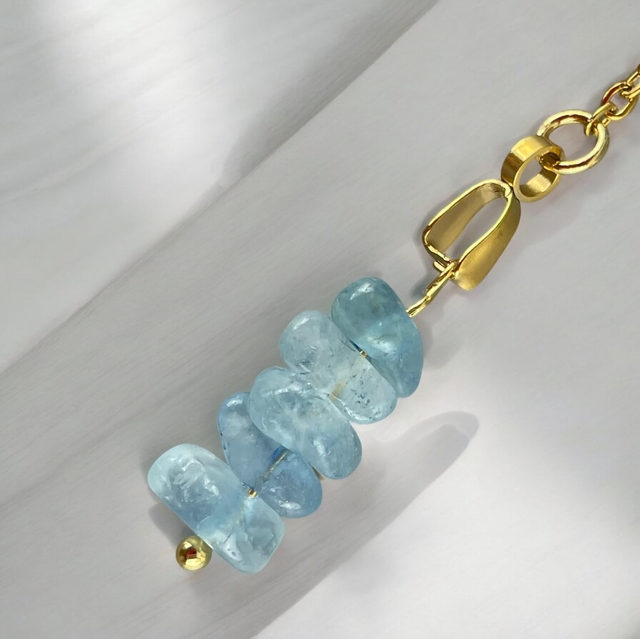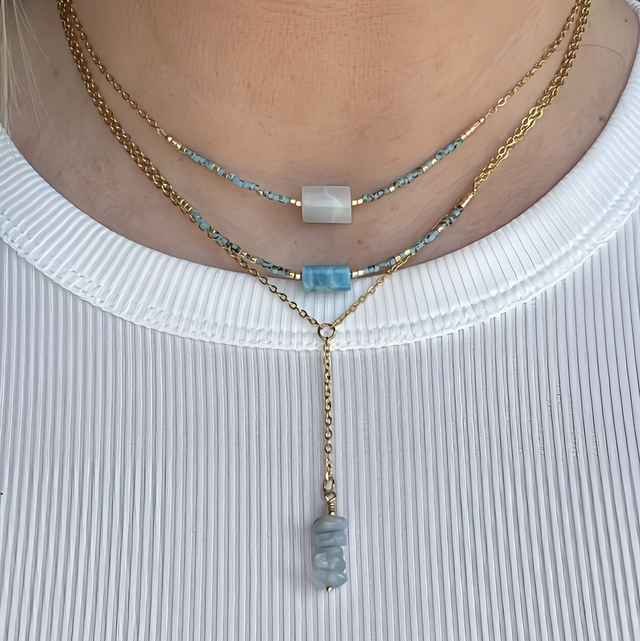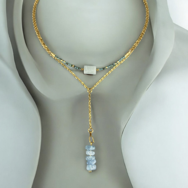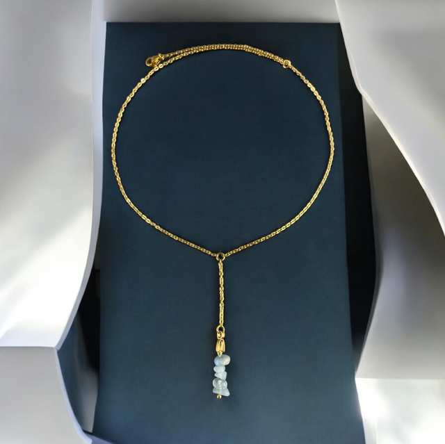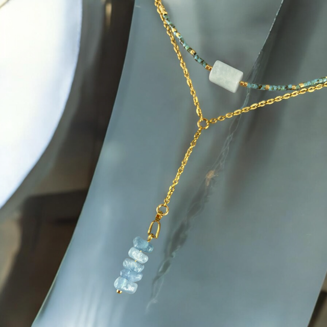 Ce collier cravate, en acier inoxydable, présente un pendentif raffiné composé de perles d’aigue-marine naturelle, montées sur une bélière. La chaîne centrale prolonge le collier, créant un look chic et élégant, idéal pour être porté seul ou superposé à des colliers plus courts.
