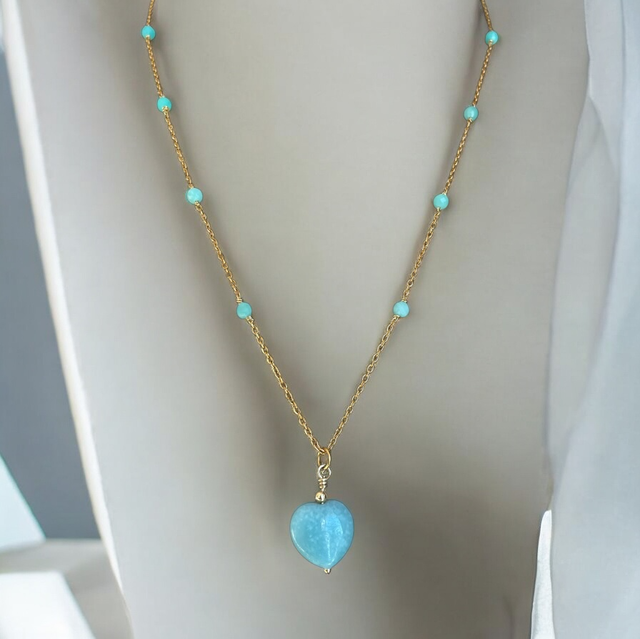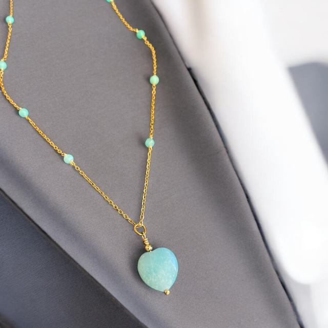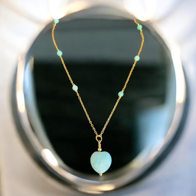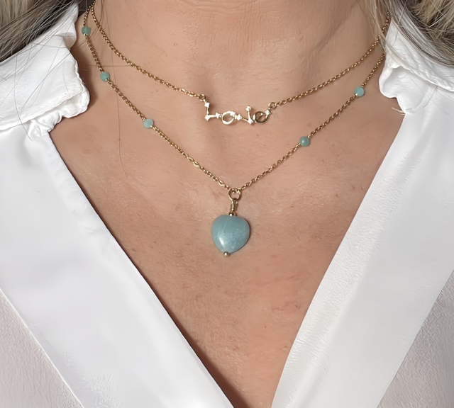 Gemme : Perles et pendentif cœur en Amazonite (14 mm)