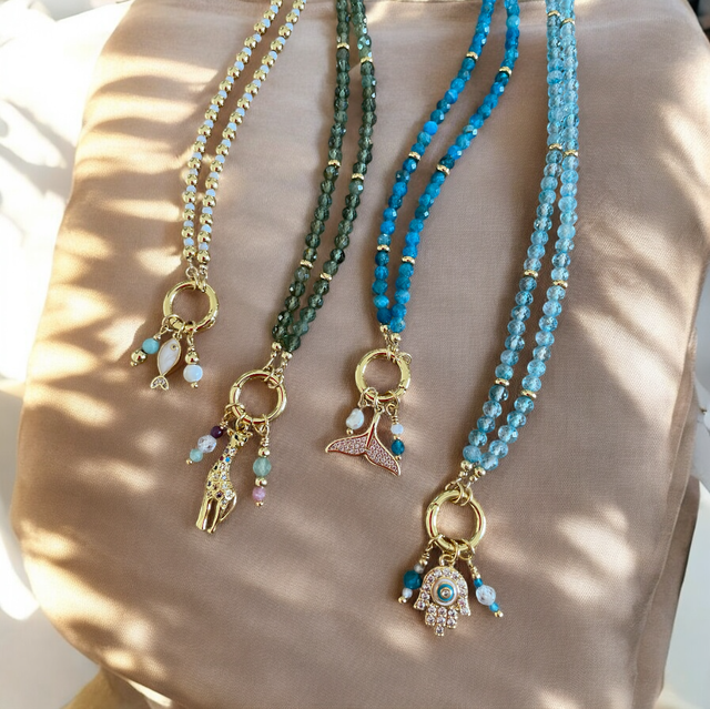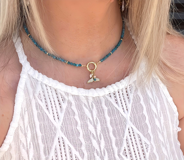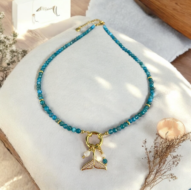Collier femme Queue de Baleine en Or 18K Rempli avec perles d'apatite et breloques pierres naturelles