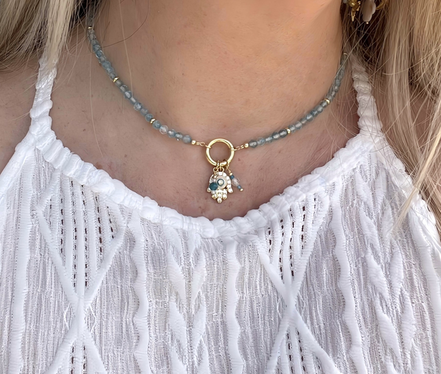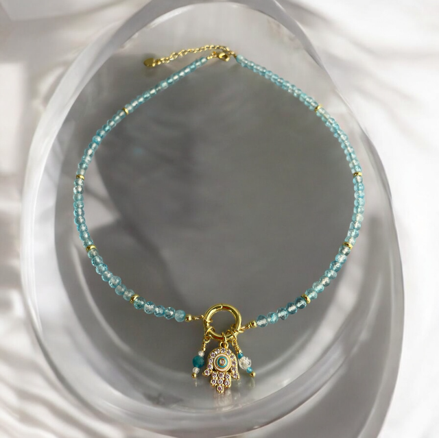 ✨ Collier femme en aigue marine & pendentif Hamsa – Bijou fait main avec breloques zircone et apatite ✨