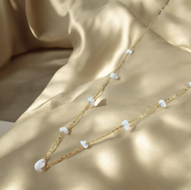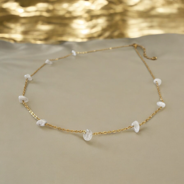 Laissez-vous séduire par l’élégance intemporelle du collier ras du cou Éclat de Lune. Sa fine chaîne en acier inoxydable est délicatement ornée de pépites de pierre de lune naturelle, offrant des reflets subtils et envoûtants. Un bijou raffiné qui illumine chaque tenue avec une touche de douceur et de mystère.