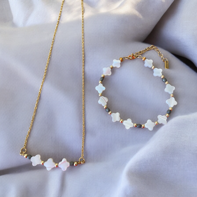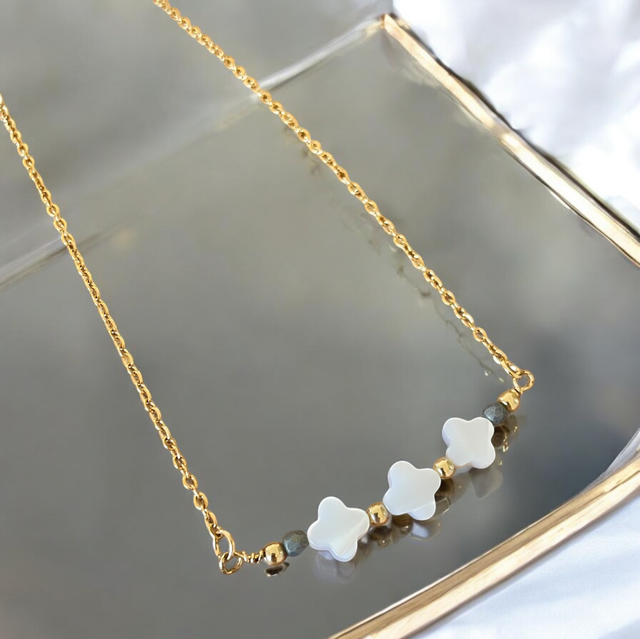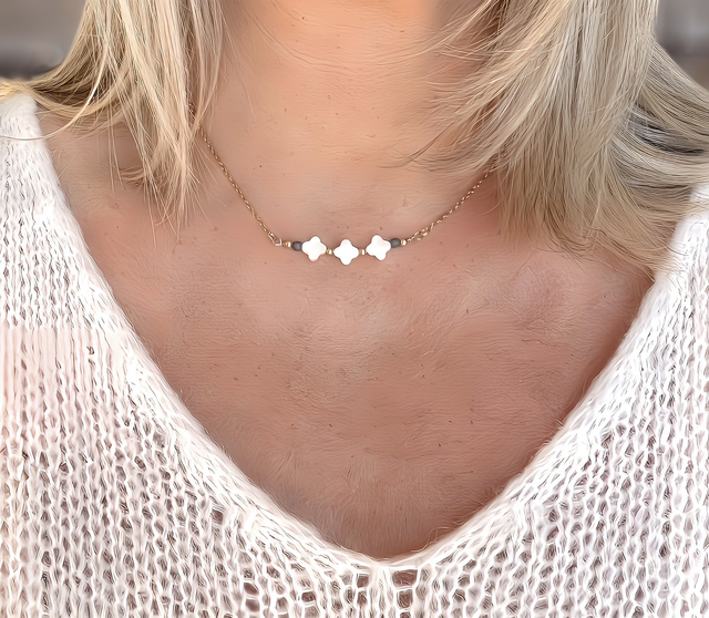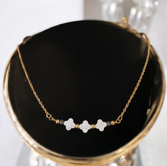 Adoptez l'élégance naturelle avec ce collier raffiné, sublimé par des trèfles en nacre aux reflets irisés et des touches de bronzite. Sa chaîne fine en acier inoxydable doré met en valeur ces pierres naturelles aux nuances délicates, créant un bijou intemporel et élégant. Idéal pour une touche de charme au quotidien ou comme cadeau symbolique, il allie nature et sophistication avec finesse.