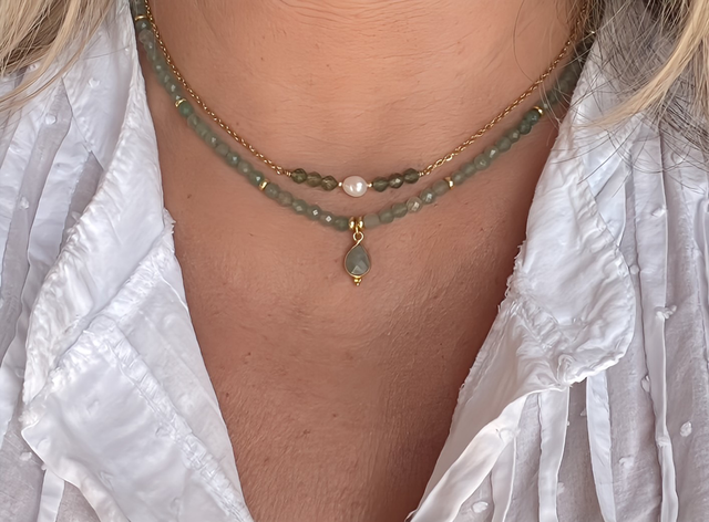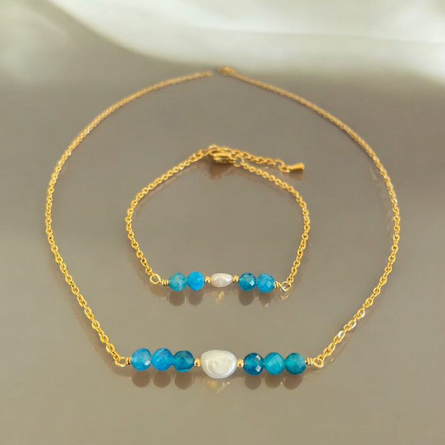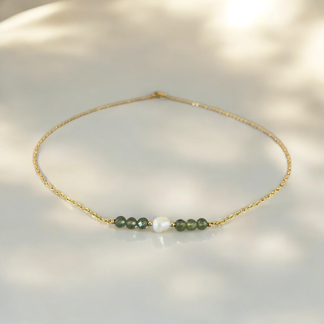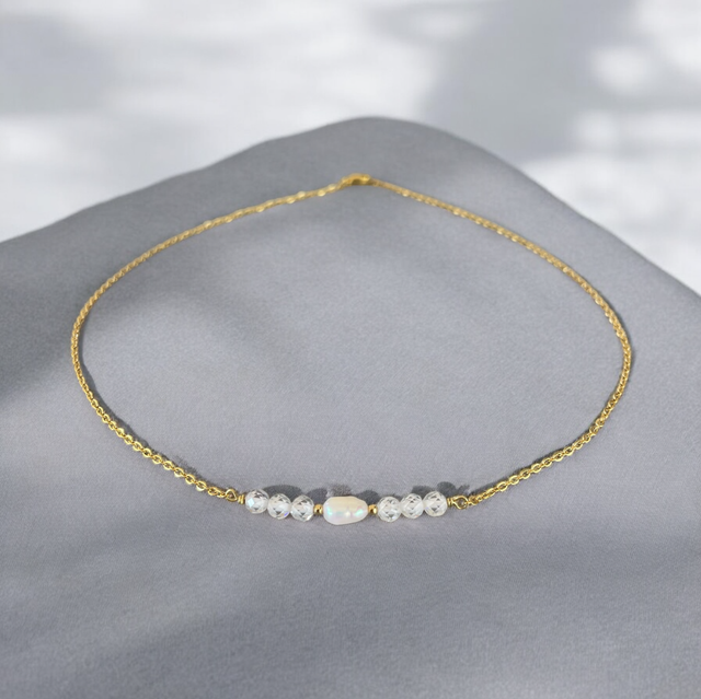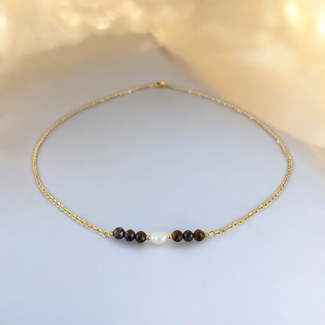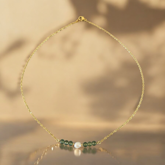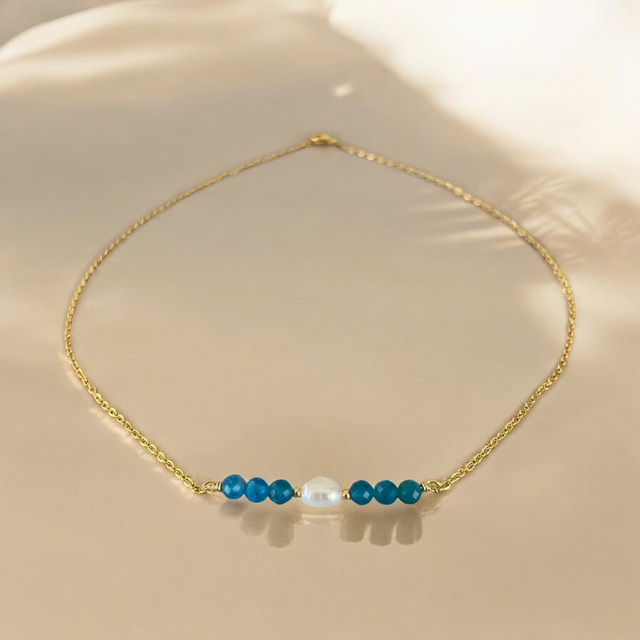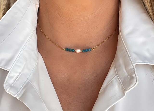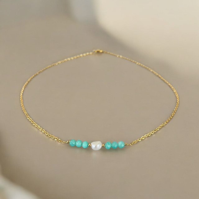 Ce collier raffiné se compose d’une fine chaîne dorée en acier inoxydable, sublimée par une perle d’eau douce au centre, encadrée de pierres naturelles. Disponible en amazonite (douces nuances bleu-vert), apatite bleue et verte (tons profonds et vibrants), bronzite (reflets bruns dorés) et zircone (éclat cristallin). Son design minimaliste et intemporel en fait un bijou élégant, idéal pour toutes les occasions.