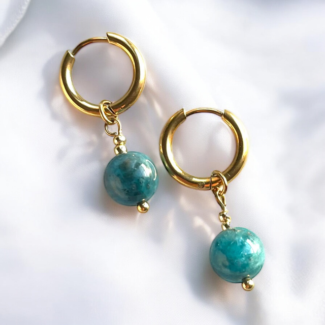Apportez une touche lumineuse et raffinée à votre style avec ces mini créoles ornées de perles d’apatite naturelles. Conçues et réalisées par Sandja Créations, elles allient élégance et durabilité grâce à leur finition en acier inoxydable doré. La teinte éclatante de l’apatite ajoute une note de fraîcheur et de modernité, parfaite pour sublimer votre quotidien.
