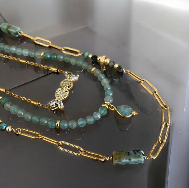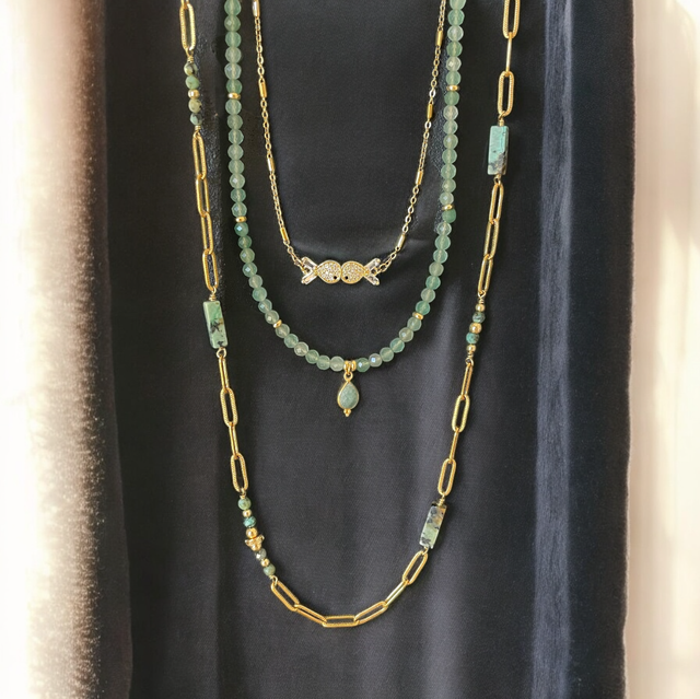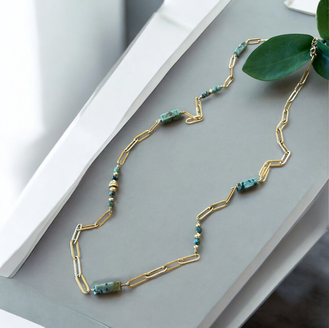 Chic et raffiné, ce sautoir fait main de 60 cm sublime votre tenue avec sa chaîne rectangle striée en acier inoxydable doré. Alternant maillons, perles tubes rectangulaires et perles facettées en turquoise africaine, il est rehaussé de perles dorées en laiton plaqué or 18K. La turquoise africaine, avec ses nuances uniques, apporte une touche de caractère et d’authenticité à ce bijou. Léger et agréable à porter, ce sautoir est idéal pour un style bohème chic ou sophistiqué.