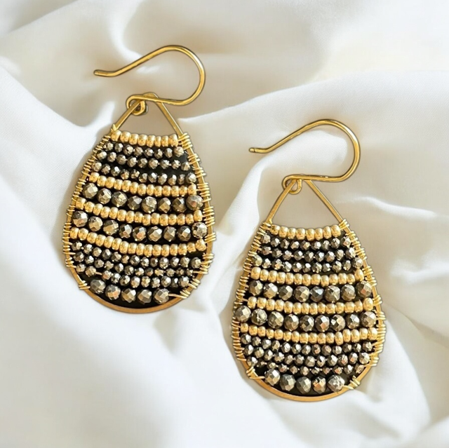 Apportez une touche bohème et raffinée à votre style avec ces boucles d’oreilles uniques, conçues à la main par Sandja Créations. L’éclat métallique de la pyrite se marie à la finesse des perles de rocaille Gold pour un bijou intemporel.