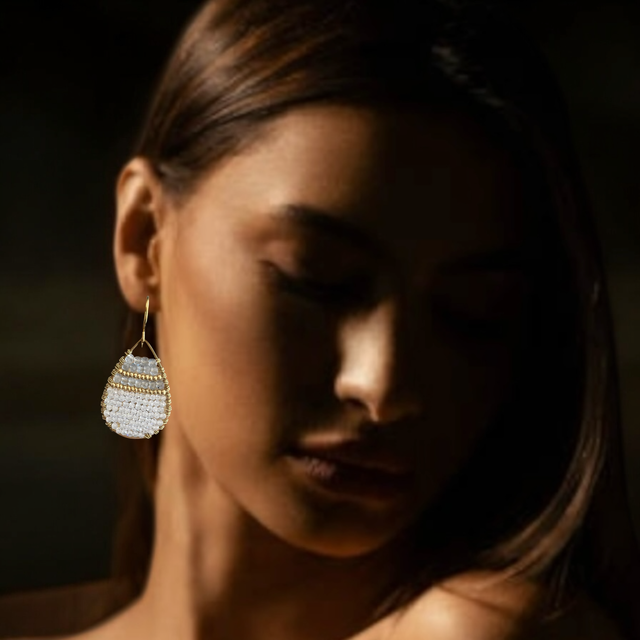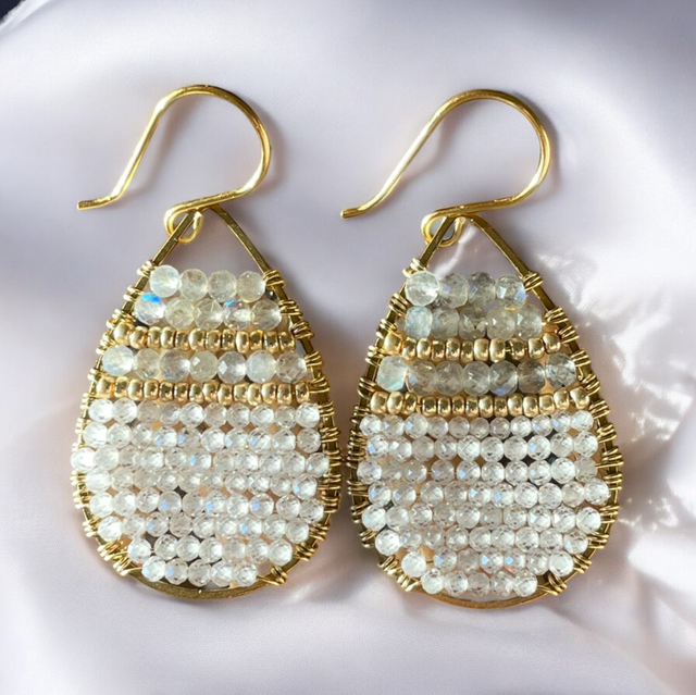 Sublimez votre style avec ces boucles d’oreilles bohèmes, conçues et réalisées à la main par Sandja Créations. Elles associent la brillance des Zircons à l’éclat envoûtant de la Labradorite, sublimés par des perles de rocaille galvanisées Gold et des apprêts en laiton brut.