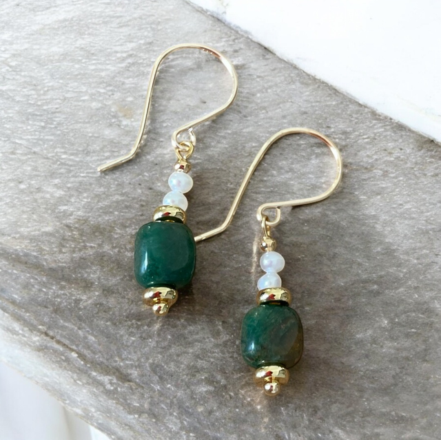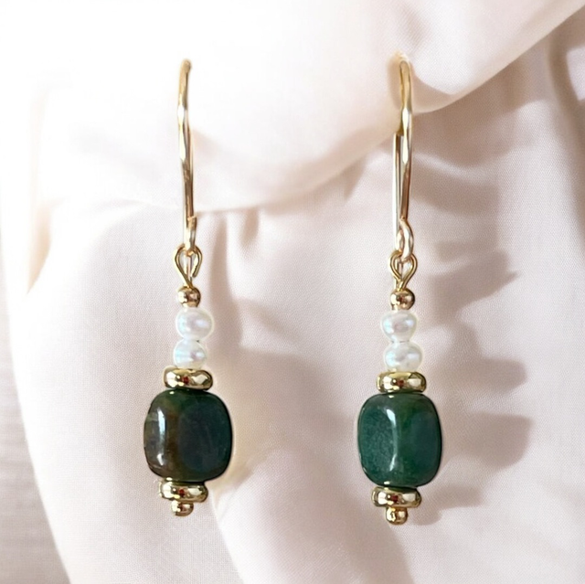 Intenses et lumineuses, les boucles Éclat de Jade combinent une base argent 925 doré (idéale pour peaux sensibles) et des dorures en laiton plaqué or 24 carats. Le pendant (~2 cm) forme une grappe raffinée composée de deux perles d’eau douce menant à une perle de jade canadien en finition, pour une ligne élégante aux nuances vertes naturelles. Création artisanale, faite main en France par Sandja Créations.