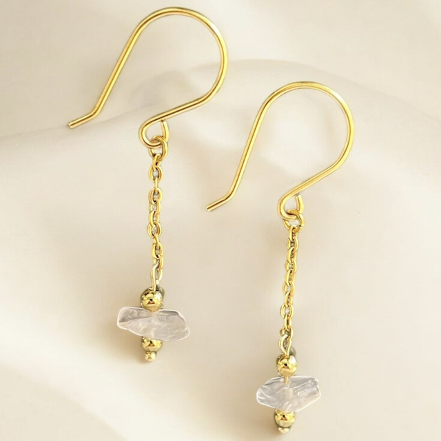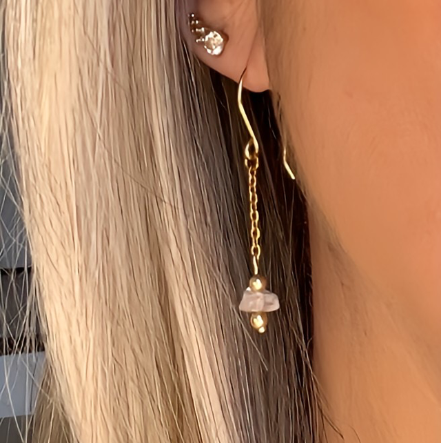 Sublimez votre style avec ces boucles d’oreilles faites main, délicates et raffinées, signées Sandja Créations. Conçues en acier inoxydable doré, elles se composent d’un crochet en laiton anti-ternissement suspendant une fine chaîne, ornée d’une perle naturelle de Quartz Rose, encadrée de petites perles dorées pour un éclat subtil et lumineux.