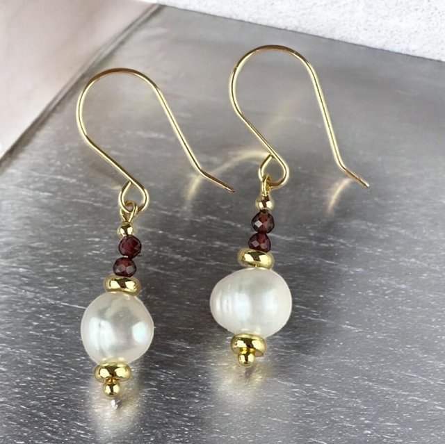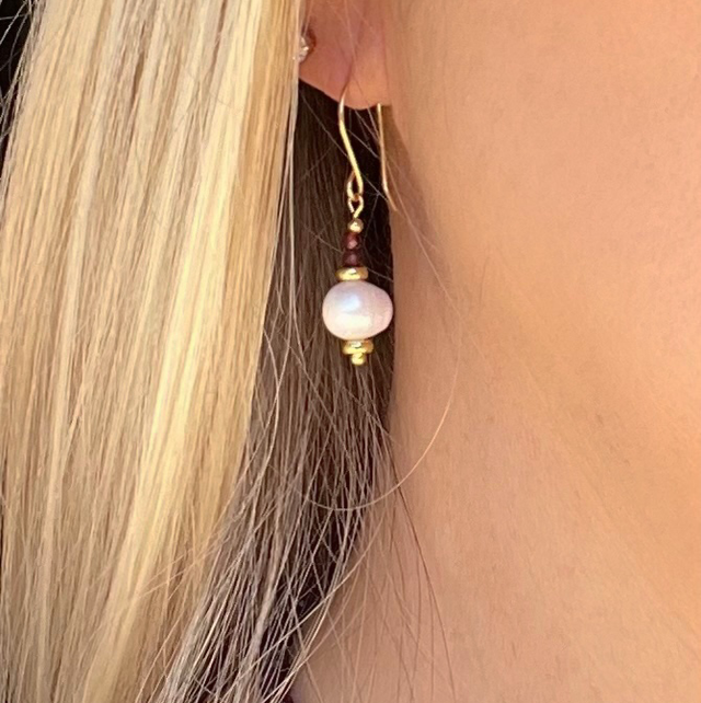 • Perles : perle d’eau douce ovale (pièce maîtresse, plus grande) + perles de grenat