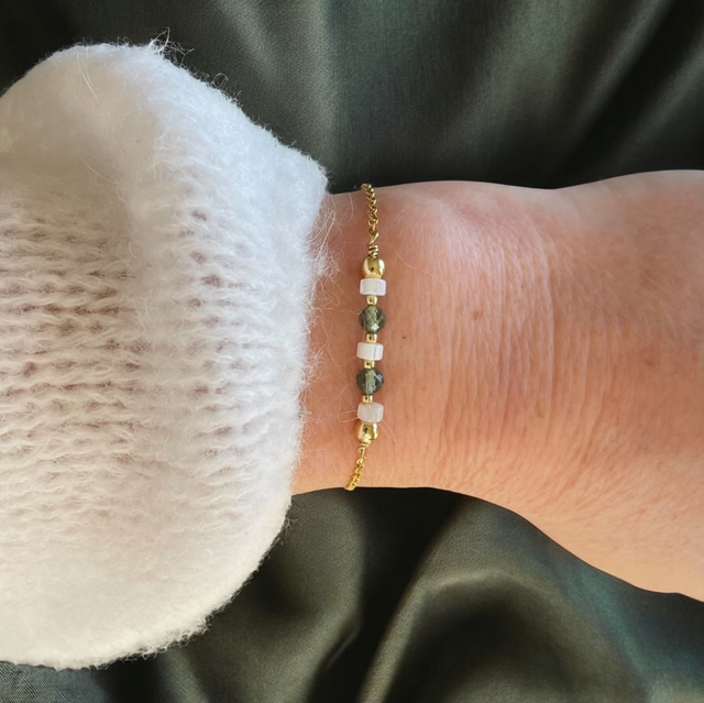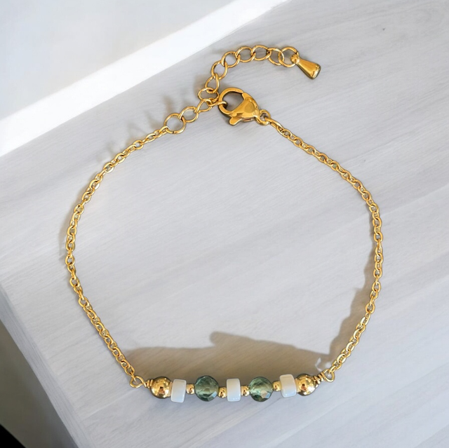 Laissez-vous séduire par la délicatesse de ce bracelet raffiné. Sa fine chaîne en acier inoxydable est ornée de perles facettées d’Apatite verte, alternées avec des rondelles de Nacre blanche et de petites perles dorées. Son éclat subtil et sa teinte douce en font un bijou élégant et intemporel, parfait pour sublimer votre poignet au quotidien. Ajustable grâce à sa chaînette d’extension, il s’adapte à toutes les morphologies.