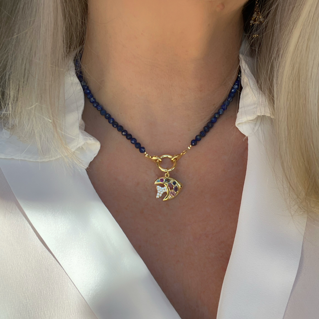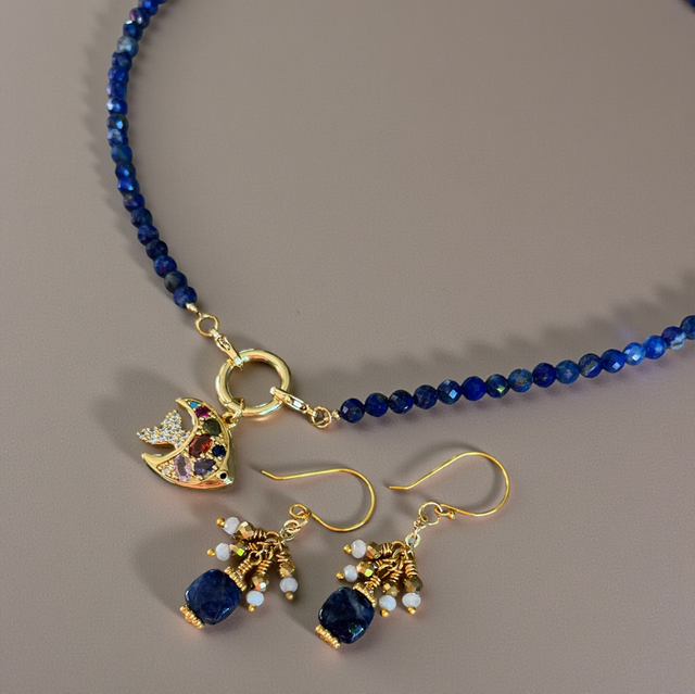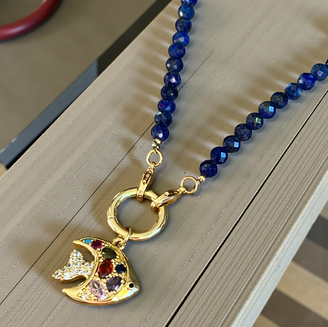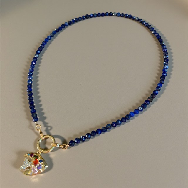 Un collier raffiné et poétique, mêlant la profondeur du lapis lazuli à l’éclat d’un pendentif poisson micro pavé CZ rempli d’or 18 carats, suspendu au fermoir rond pour une touche originale et élégante.